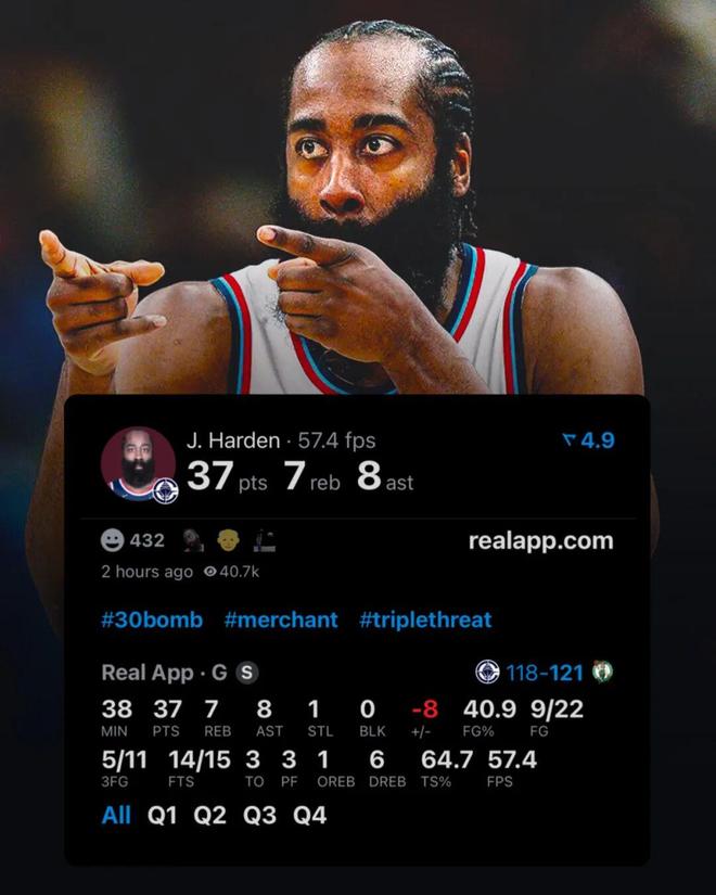 尽管如此,哈登依然打出了让人钦佩的一场比赛:全场出战38分钟,投篮22中9,三分11中5,罚球15中14,拿下37分7篮板8助攻。